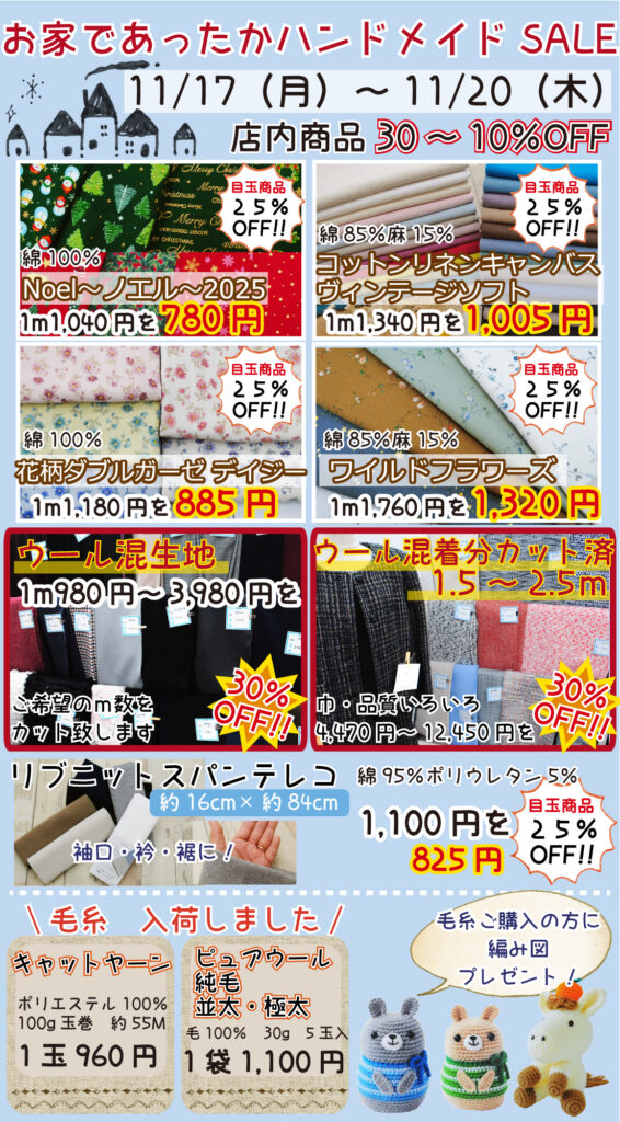 【かんたん手編みのシュシュ 11/27(木)】☆1DAY講習☆【ワイドパンツ 11/26(水)・12/3(水)・12/10(水)】